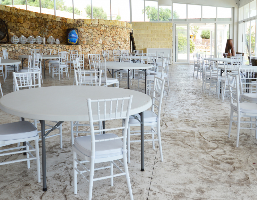 Plam Stampable, stamped concrete floor white color, tawny shades. Hotel Capo Campolato, Siracusa, Italy