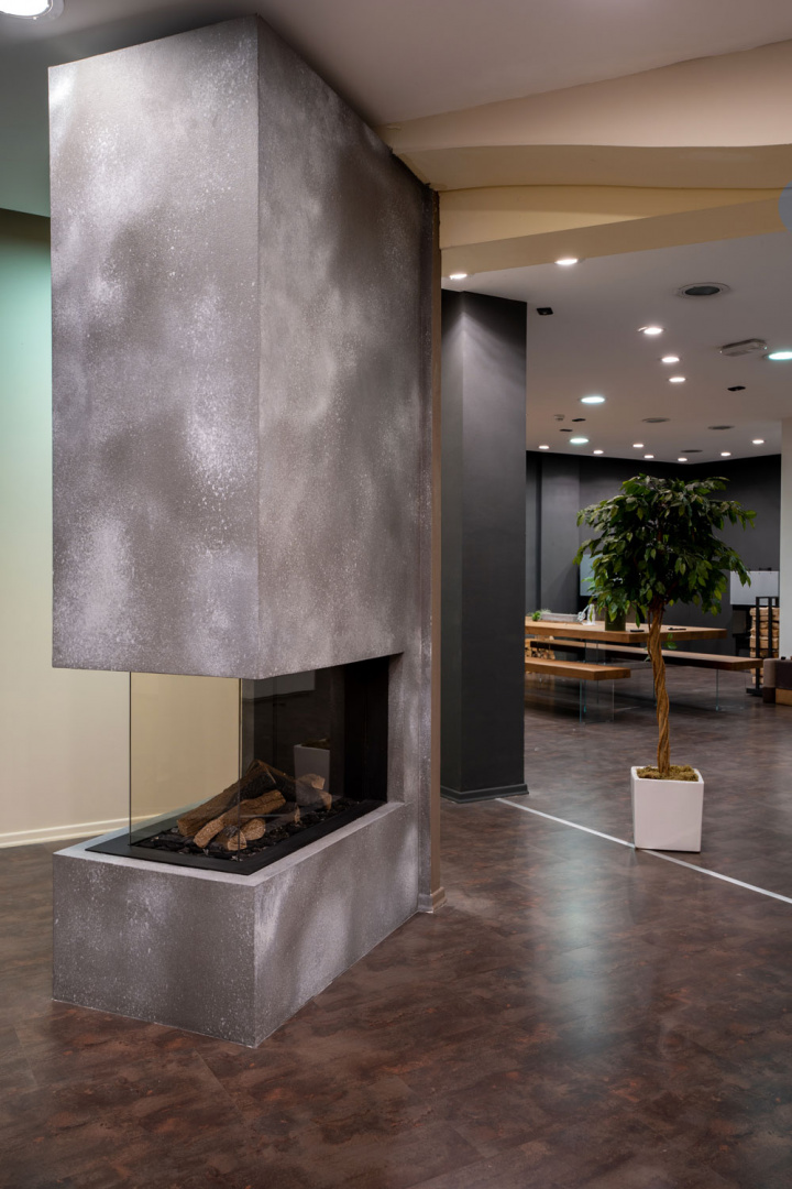 Plamina, ferro metal effect coating. Gas fireplace, Montexport, Vittorio V.To TV