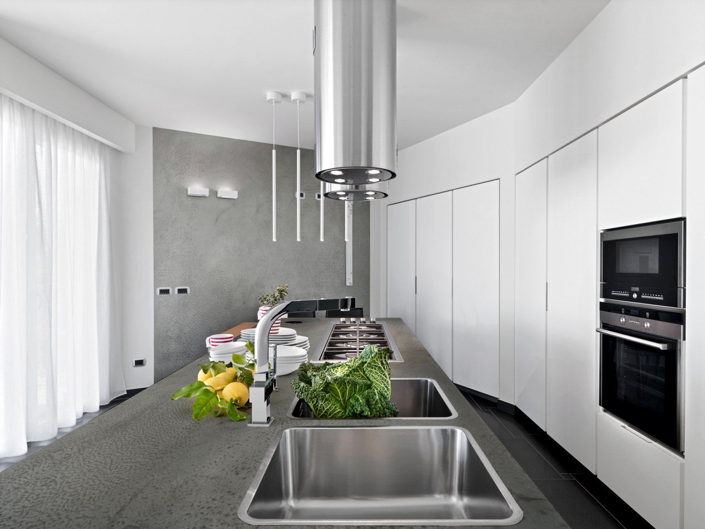 Microverlay, low thickness vertical cement-resin coating with cotton and gray finish. Caminetto Montexport, Vittorio V. To TV