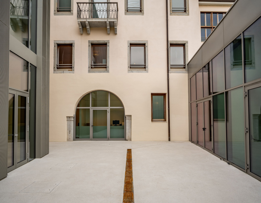 Accesso al Museo d’Arte Moderna e Contemporanea di Udine con superfici spazzolate outdoor resistenti e antiscivolo.