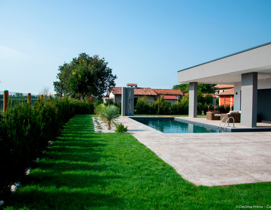 Plam Stampable, stamped concrete floor in light gray, medium gray shade. Merlengo, Italy
